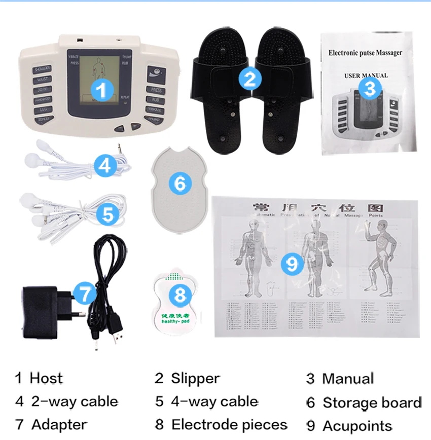 1. Массажер * 1 (на русском и английском языках мы отправим вам товар по вашему выбору) 2. Электроды * 16 (8 пар в комплекте) (Если вам нужно больше электродов, вы можете заплатить больше по этой ссылке:Http:/store/product/10Pcs-5-pairs-lot-Low-Frequency-Electrode-Pads-for-Digital-TENS-Therapy-Machine-Electronic-Cervical-Physiotherapy/2683005_32806986279.html?spm=2114.12010612/itm2home-1.0.0.2c811784oZPdek) 3. USB кабель * 1 4. Адаптер питания * 1 5. Руководство пользователя на английском языке * 1 (руководство на русском языке может быть отправлено по электронной почте) 6. Соединительный кабель * 2 (2-way и 4-полюсным) 7. Массажные перчатки * 2 (1 пара в комплекте, размер L, если вам нужен размер XL, пожалуйста, укажите это в заказе или отправьте нам сообщение, спасибо) 8. Тапочки * 2 (1 пара в комплекте, длина около 26 см, можно регулировать с помощью липучки)