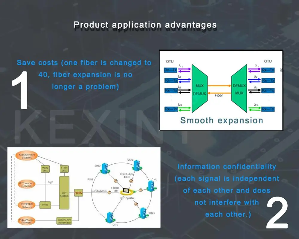 WDM основан на проверенной тонкопленочной фольтерной технологии. Этот WDM широко используется в волоконно-оптической системе связи и EDFA, где нужны плоские и широкие рабочие полосы.