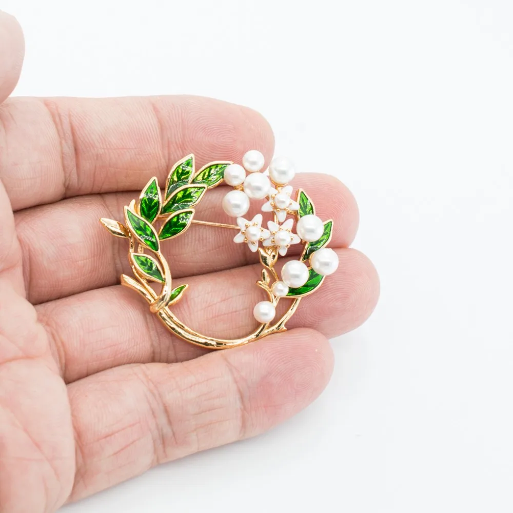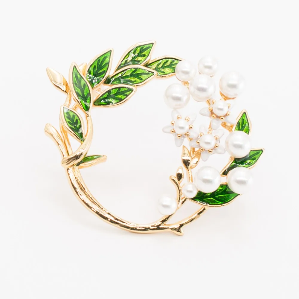 Описание: Высококачественная брошь в виде оливковой ветки, изготовленная из эмали и искусственного жемчуга.