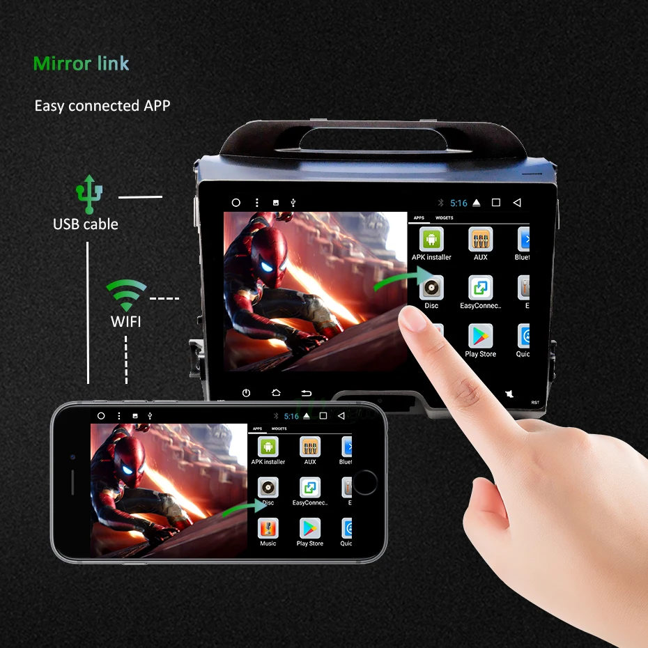 Вы можете подключить свой мобильный телефон к этому радио с помощью функции mirror link. Экран Радио покажет мобильный телефон, как зеркало. И радио может управлять ваш мобильный телефон, так что вы можете слушать мобильный телефон музыку или совершать звонки через радио экран.