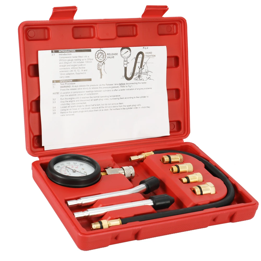 Этот автомобильный тестер Сжатия Работает с большинством моделей автомобилей с бензиновыми двигателями. Он поставляется с адаптерами и трубами разных размеров для разных моделей. Широко используется для быстрой и точной проверки сжатия на цилиндре двигателя.