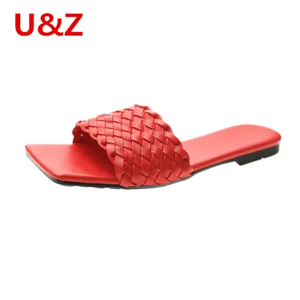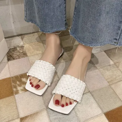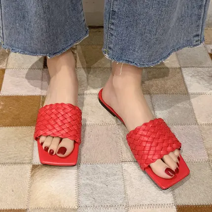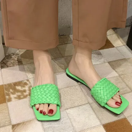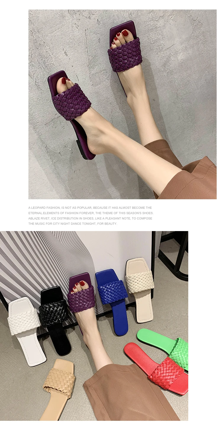 Популярные шлепанцы в США; Женская пляжная обувь; Летние модные плетеные сандалии на плоской подошве; Новинка 2020 года; Тапочки с открытым носком и квадратным каблуком; Тканая женская обувь для учащихся