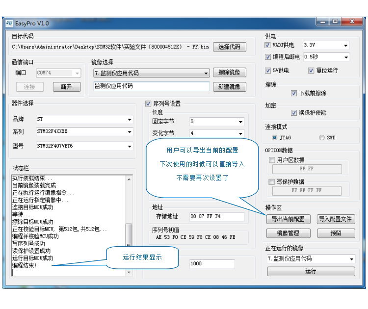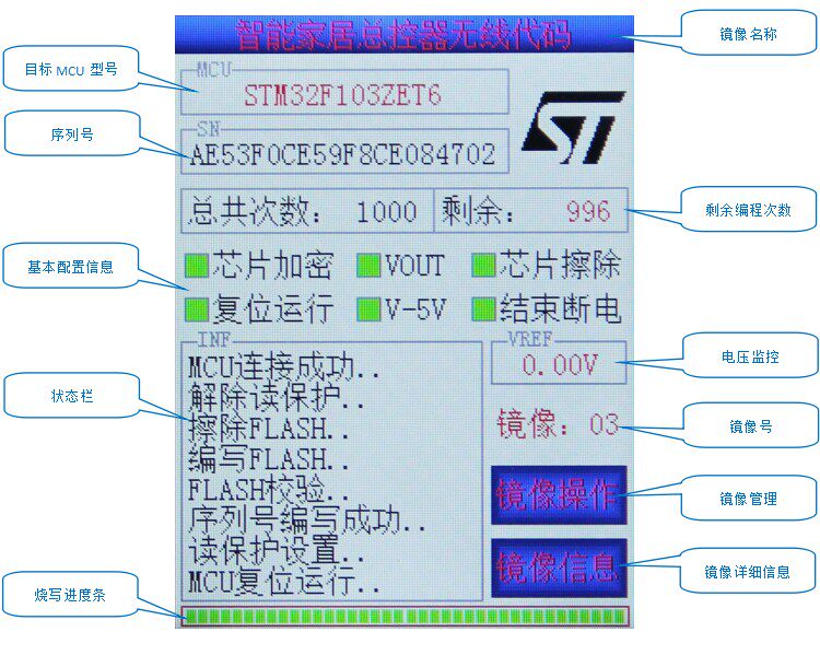 * Это устройство поддерживает полный спектр STM32, включая: STM32F0, STM32F1, STM32F2, STM32F3, STM32F4, STM32F7, STM32L0, STM32L1, STM32L4.* Это устройство поддерживает несколько зеркальных операций и имеет эксклюзивную функцию управления зеркалом. Он может удалять, блокировать и блокировать соответствующие изображения по мере необходимости. В то же время вы можете установить изображение по умолчанию на загрузке.* Устройство может быть названо для каждого изображения, что позволяет легко различать операции.* Это устройство поддерживает HEX, BIN и другие форматы файлов.* Это устройство поддерживает функцию сжигания серийного номера и может гибко настроить Серийный номер: фиксированный байт и переменный байт, настройка длины, размер и настройка конца.* Это устройство может быть настроено с ограниченным количеством времени программирования, чтобы позволить пользователям контролировать количество времени горения.* Это устройство поддерживает различные источника питания режимов. 5 в может поставляться внешне, а VADJ может поставляться внешне. VADJ внешнего источника питания может быть отрегулировано произвольно между 1,8 V-4,5 V.* Это устройство поддерживает автоматическое отключение питания после сжигания.* Это устройство может настроить удаление операции перед загрузкой.* Это устройство может настроить функцию защиты чтения.* Программное обеспечение устройства поддерживает импорт и экспорт файлов конфигурации, что удобно для пользователей.* Это устройство поддерживает онлайн-операции и может переключать зеркальное отображение, работающее на линии.* Это оборудование поддерживает умное управление столом стрельбы.* Это устройство может разоблачить протокол управления компьютерным терминалом, и пользователи могут разрабатывать устройства управления программным обеспечением приложений.* Данное устройство может быть обновлено на неопределенный срок. Мы регулярно запускаем новую прошивку (поддерживая новейшие чипы) для пользователей.* Это устройство 2,8 дюймов большой TFT экран, а также поддерживает Сенсорное управление и человеко-машинный интерфейс связи хорош.