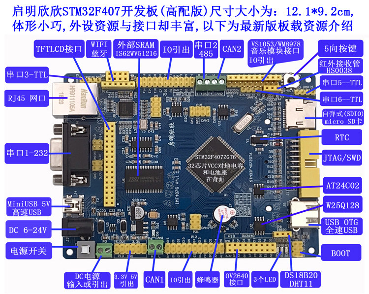 1, Процессор: stm32f407zgt6 LQFP144, FLASH:1024K, SRAM:192K, 5 независимых последовательных портов ADC, DAC... 2, универсальный, универсальный 3. Внешнее расширение 1 м SRAM IS62WV51216 4, драйвер FSMC ЖК-интерфейс 5, W25Q128 FLASH 16M 6, EEPROM AT24C02 7, слот для tf-карты (слот для micro SD) 8, USB FS (USB OTG...) 9. Осциллятор RTC clock crystal принимает официальные рекомендуемые параметры кристалла и подходящую Емкость 6P. Больше не бойтесь вибрации RTC, например, использования цилиндрического кристаллического осциллятора 32,768 K, Вибрация может не быть. 10, последовательный порт 1-RS232 интерфейс 11, последовательный порт 2-RS485 интерфейс 12, последовательный порт 3-TTL 13, 4 независимых ключа 14, 3 светодиодный 15, инфракрасная трубка приемника (не с HS0038) 16. Интерфейс датчика температуры (не с 18B20) 17, зуммер 18, CAN (TJA1050) 19, интерфейс 4 модуля Bluetooth (модуль Bluetooth приобретается отдельно) 20, серия ESP8266, порт WiFi, интерфейс модуля (Wi-Fi модуль приобретается отдельно) STM32F407ZGT6 чип, краткая информация: 1, ядро: Cortex (TM) -M4 CPU ARM 32 бит 2, Рабочая частота: 168 МГц, рабочая частота (онлайн-тест до более 200 МГц), когда доступна память в течение 0 периода ожидания, оно может достигать 1,25 DMips/МГц (Dhrystone2.1). 3, рабочее напряжение и посылка: 1,8 до 3,6 вольт источника питания и I/O pin. 4. Память: память объемом до 1024K, память флеш-памяти, 192 + 4 КБ S RAM, которая включает в себя 64 байта CCM (ядро вместе с памятью) ОЗУ, и гибкие статические контроллеры памяти поддерживают флэш-память, S RAM, PS RAM, NAND и память. 5, низкомощный дизайн: режим сна, простоя и в режиме ожидания, VBAT обеспечивает RTC, 20x32 бит резервный регистр + опциональное 4 КБ резервный SRAM 6, интерфейс ресурсы: 3 12 битный аналого-D аналого-цифровой преобразователь, 1 му s время преобразования (до 24 входных каналов), 2 канала 12 бит D/A постоянного тока в переменный конвертер, контроллер DMA 12 каналов, до 140 портов ввода/вывода, 136 быстрых портов I/O до 84 МГц, I/O, 17 портов таймера (независимая, тип окна), 15 интерфейсов связи, 3 интерфейса I2C (поддержка SMBus/PMBus), 138, 5 В 3 SPI интерфейс (37,5 М бит/сек), 5 USART интерфейсов с поддержкой ISO 7816, LIN, интерфейсу IrDA и модуляции и демодуляции, 2 многоразовые I2S интерфейс, 2 USB2.0 полной скорости интерфейса, 2 может интерфейс связи, 8-14 бит параллельный интерфейс камеры 54 Мбит/с, 10/100 Ethernet MAC выделенной DMA и SDIO, ФКЦБ интерфейс 7, загрузка отладока: последовательная, одиночная, отладочная (SWD) и интерфейс JTAG, встроенный модуль отслеживания (ETM), (ETM), Cortex-M4. 8, генератор случайных цифр 9, компьютерный блок CRC 10 и 96 бит идентификации 11, RTC: точность одной секунды, аппаратный календарь (см. Официальное руководство по информации на веб-сайте).