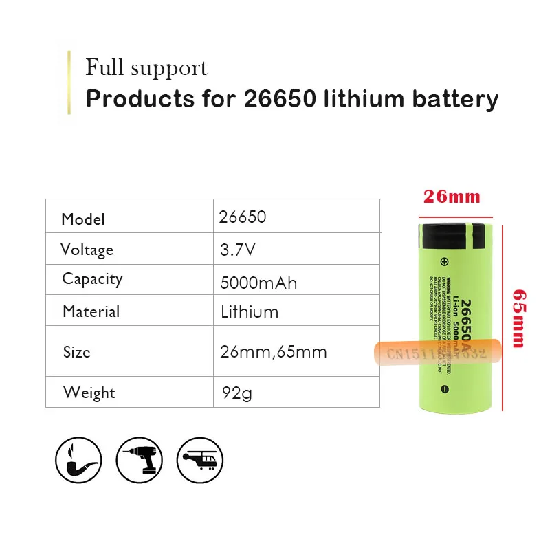 Название: для литиевых батарей panasonic 26650Спецификация: Диаметр: 26 мм, Длина: 67 ммВес: 94 гСреднее напряжение: 3,7 VПолное электрическое напряжение: 4,2 VКритическое разрядное напряжение: 2,6 VНоминальная емкость: 5000 мАчНоминальный ток разряда: 5 a (1 c)Максимальный ток разряда: 10 a (2 c, мгновенный)Сопротивление: измеренное 30 m Ω