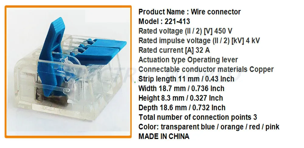 Название продукта: домашний соединительный провод/электрические провода разъемы/провода соединительные клеммы/разъем питания/гнездо разъема Модель: PCT-212 / PCT-213 / PCT-214 / PCT-215 /PCT-218 221-412 / 221 + 413 / 221-414 / 221-415 SPL-1 / SPL-2 / SPL-3 / SPL-4 Номинальное напряжение: 400 В Номинальное импульсное напряжение: 4КВ 100% новый, никогда не использовался. Название продукта: 2-полюсный Универсальный соединитель провода (2 разъема) Цвет: серый + оранжевый/цвет насыщенный/прозрачный Красный/синий/розовый/оранжевый