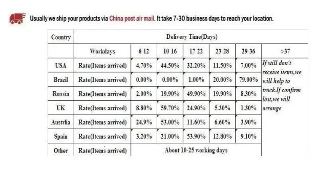 Просто отправьте авиа-отправление Почты Китая, нужно около 15-25 рабочих дней. Если вам нужны товары срочно, пожалуйста, выберите способ доставки DHL или EMS и оплатите дополнительную доставку (5-9 дней, чтобы приехать).
