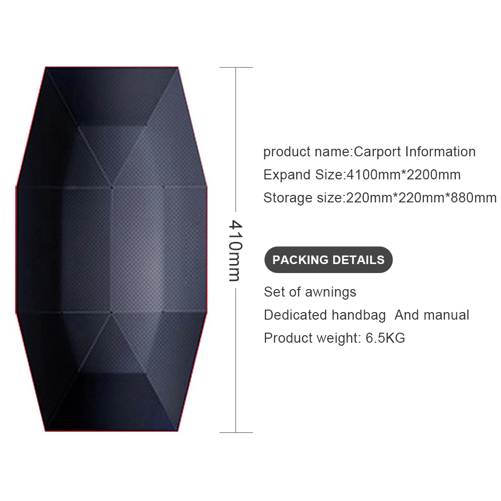 Полуавтоматический автомобильный зонт, эргономичный дизайн ручки, прост в эксплуатации, устанавливается всего за 30 секунд.Двойной ветрозащитный дизайн, сильное двойное вакуумное всасывание, углеродный композитный зонт из волокна, стабильность и баланс гарантированы.Oxford 210D, серебряное покрытие высокой плотности, водонепроницаемое, антиразрывное и огнестойкое, долговечное и долговечное, легко моется.Сильная защита от ультрафиолета и устойчивость к высоким температурам, эффективно снижает температуру в автомобиле.Эффективное Температурное охлаждение, большая площадь покрытия, лучше защищает ваш автомобиль от дождя, пыли, Листьев, птичьих капель и так далее.Стальная Противоугонная Веревка, не может легко отрезать, Силиконовая защита, чтобы избежать повреждения краски.Универсальная установка, легкая и компактная, экономия пространства для большего хранения, удобство и практичность в использовании.Поставляется с четырьмя ветрозащитными крючками, Повесьте на дверную ручку автомобиля и зеркало заднего вида, чтобы противостоять сильному ветру.Характеристика:Открытый размер: appr.157.5 * 82.6 дюймов/400*210 см (Д * Ш)Размер хранения: appr.34.2 * 10,2*7 дюймов/87*26*18 см (Д * Ш * В)Цвет: темно-синий/серебристый/КамуфляжныйВ коробке1 * Автомобильный зонт1 * ручная сумка1 * Руководство пользователя![]()