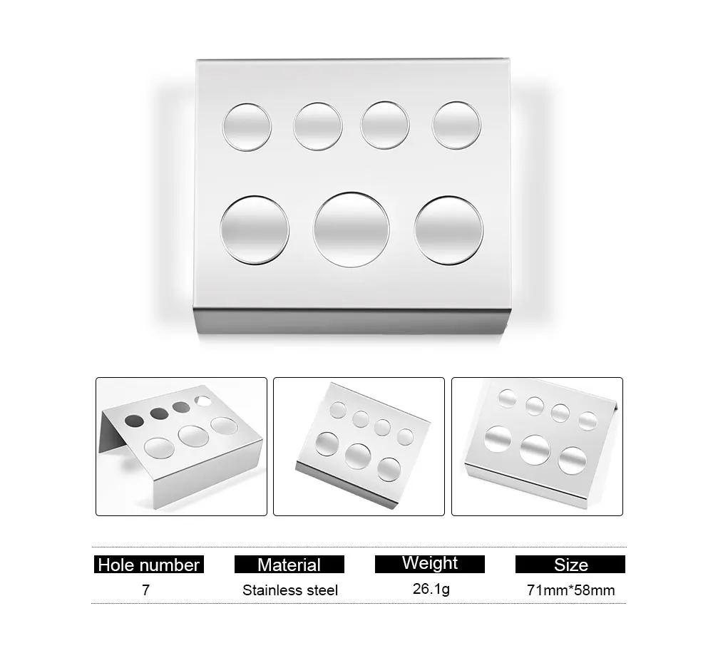 Название бренда: Biomaser Тип: аксессуары для тату Номер модели: держатель для тату Материал: нержавеющая сталь Размер: 13*6*3 см Доставка: Бесплатная доставка Цвет: серебристый, синий, черный Отверстия: с отверстиями 6/7/8/21 Характер: высокое качество Перманентный макияж для кожи: инструменты для перманентного макияжа/аксессуары remorque Характеристика: Изготовлен из высококачественного материала, достаточно прочный для тату. Идеально подходит для размещения пигмента или чернил для тату. Подходит как для профессионального, так и для домашнего использования. Уникальный дизайн и красивый внешний вид делают его хорошее совпадение для украшения дома.