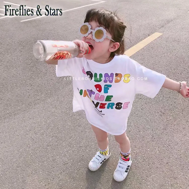 Название: Летняя длинная футболка для девочек; Футболка для малышей; Детские топы для отдыха; Детская повседневная одежда; Цветная футболка с рисунком и надписью для детей от 2 до 9 лет