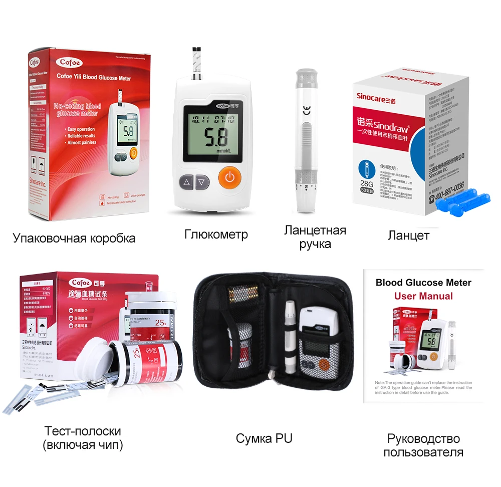 ① метр с 50 полосками = 1 инструмент (батарея в комплект не входит) +1 ручка для прокалывания + 1 коробка тест-полосок (50 шт.) +1 коробка игл (50 шт.) +1 сумка из ПУ кожи ② метр с 100 полосками = 1 инструмент (батарея в комплект не входит) +1 ручка для прокалывания + 2 коробки с тест-полосками (100 шт.) + 2 коробка с иглами (100 шт.) +1 кожаная сумка из ПУ ③ 50 шт. Полосок = 1 коробка тест-полосок (50 шт.) +1 коробка иголок (50 шт.) ④ 100 шт. Полосок = 2 коробки тест-полосок (100 шт.) + 2 коробки иголок (100 шт.)