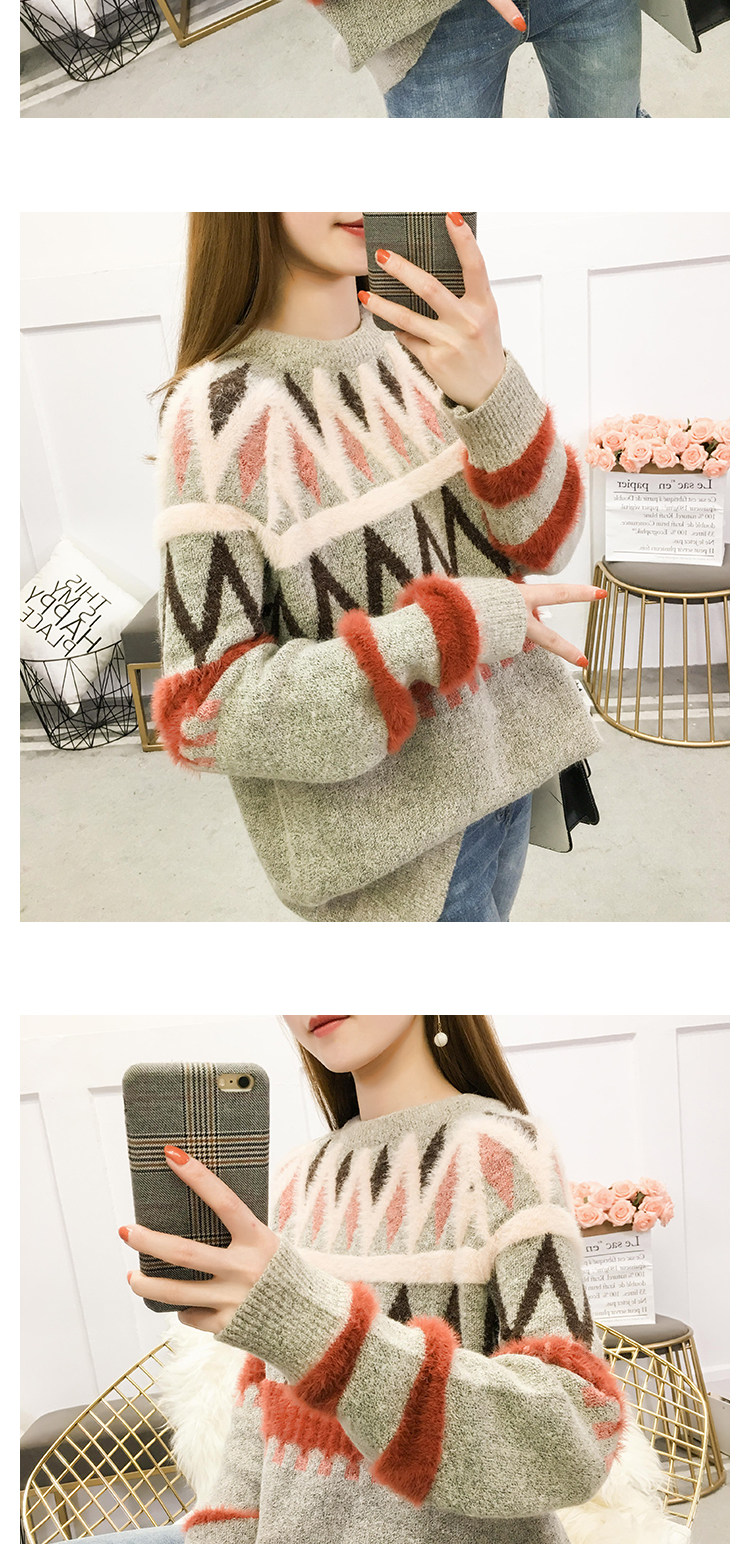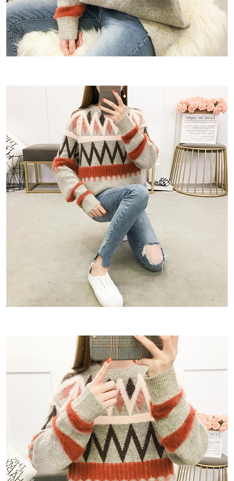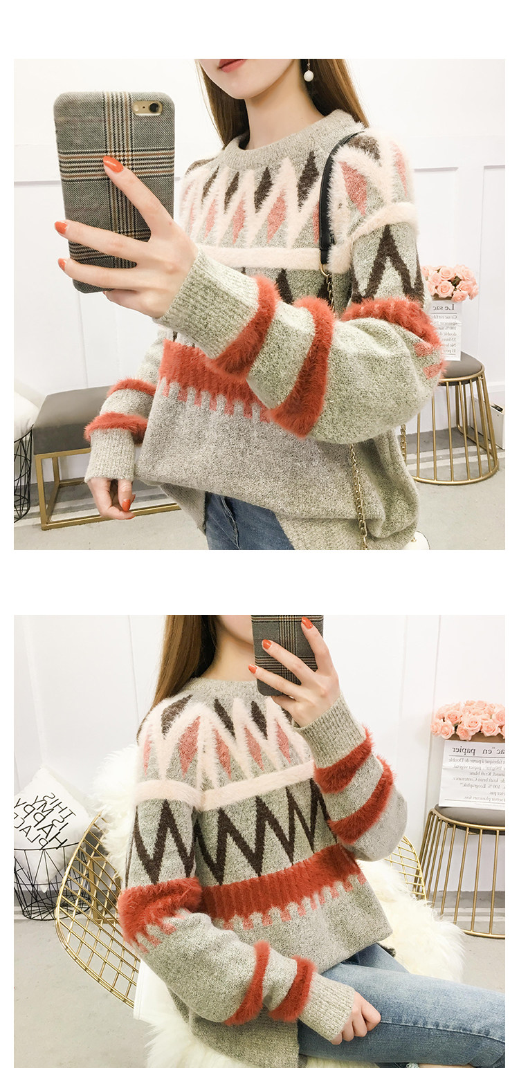 Женский трикотажный свитер зимний контрастный полосатый рукав вышивка листьями