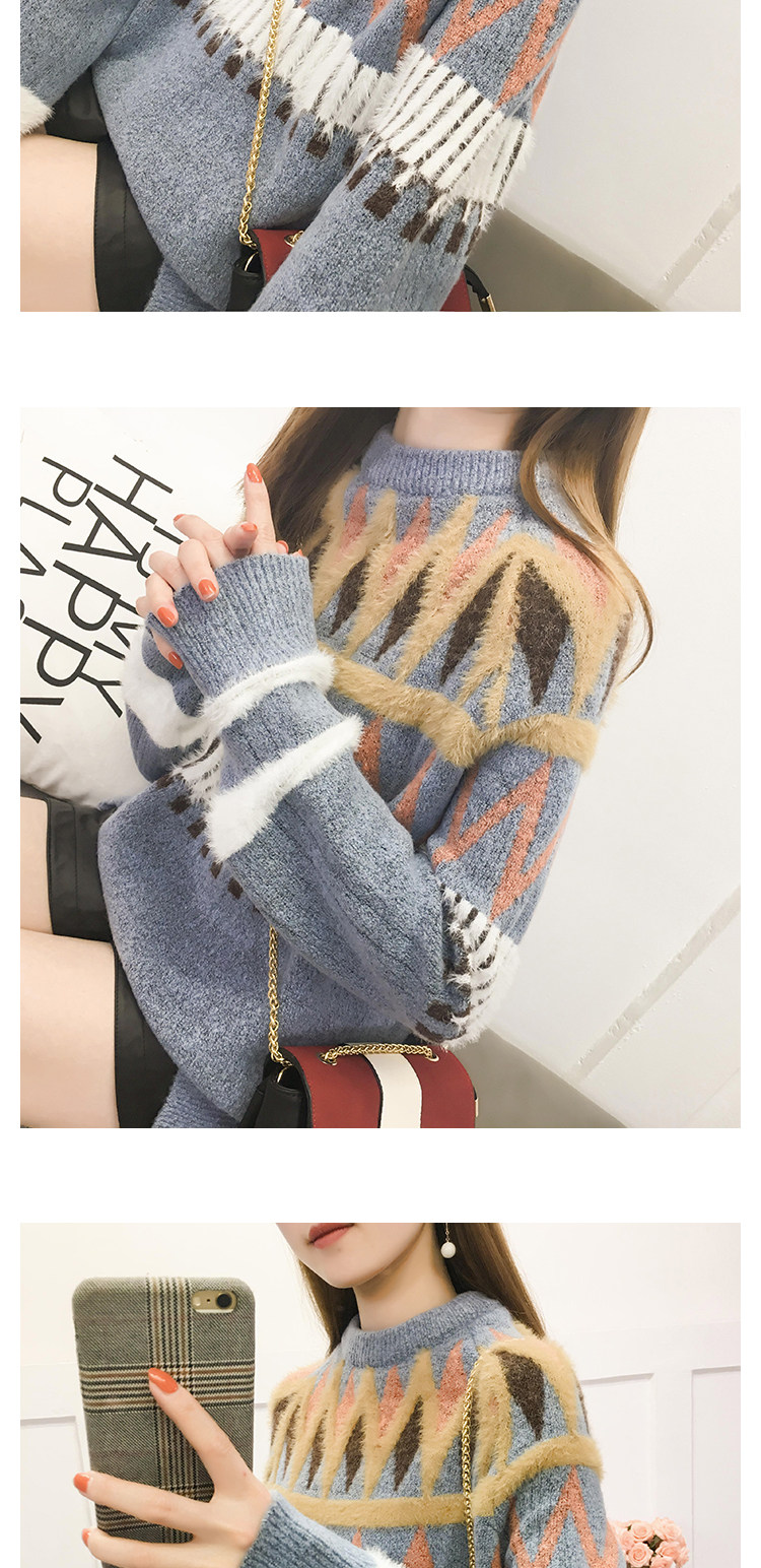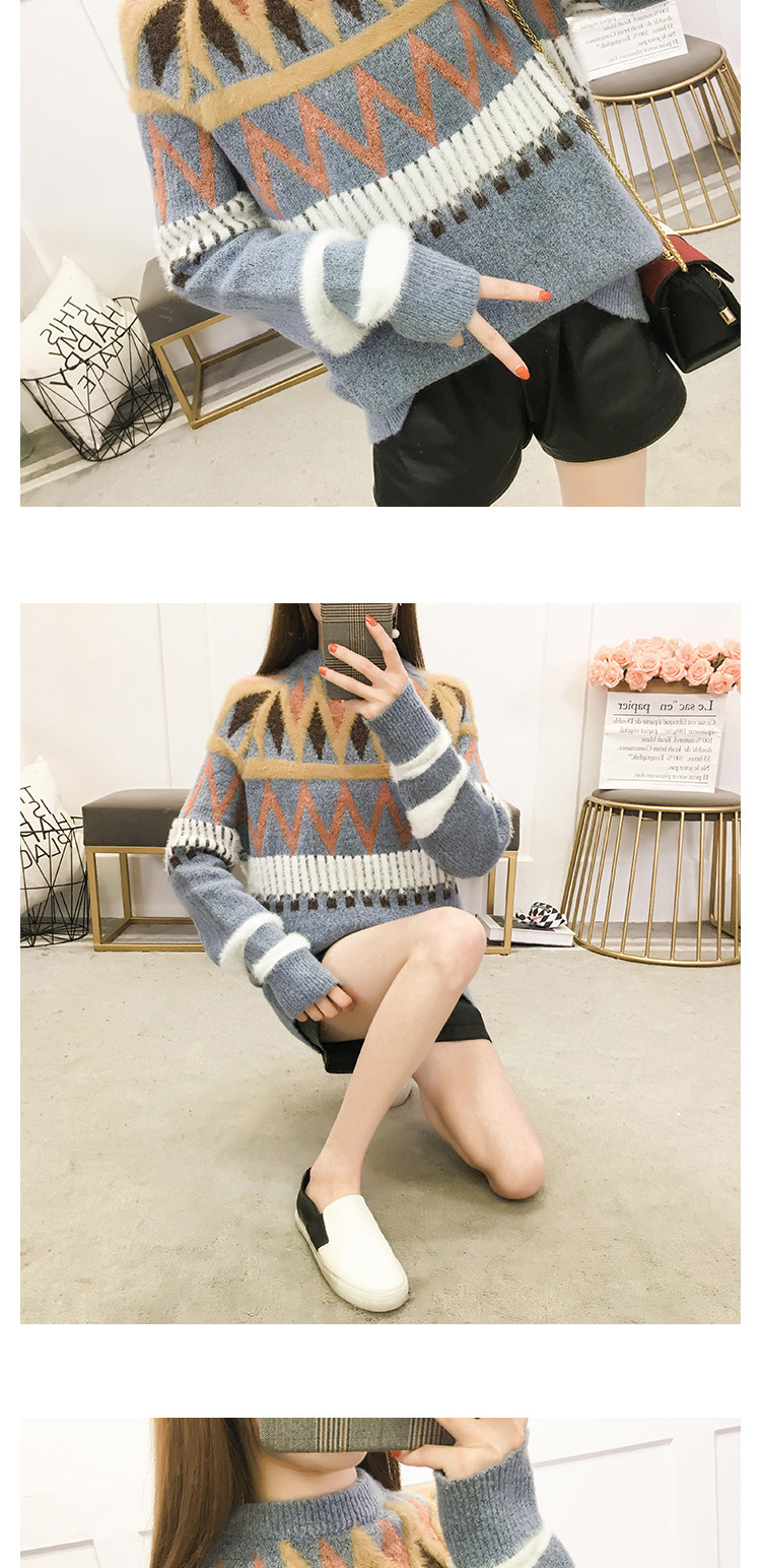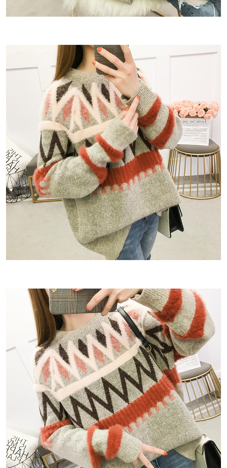 Женский трикотажный свитер зимний контрастный полосатый рукав вышивка листьями