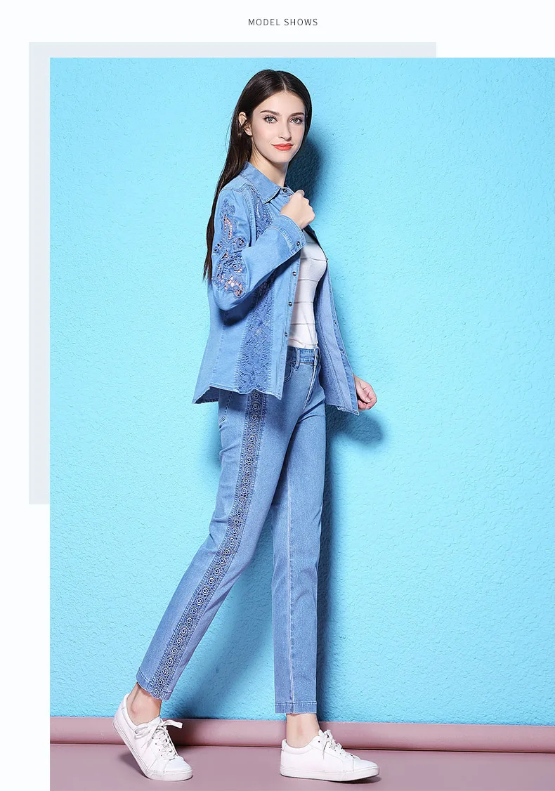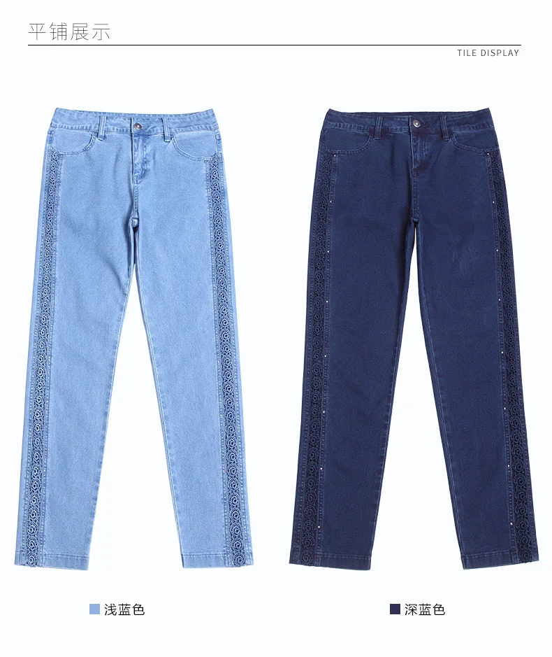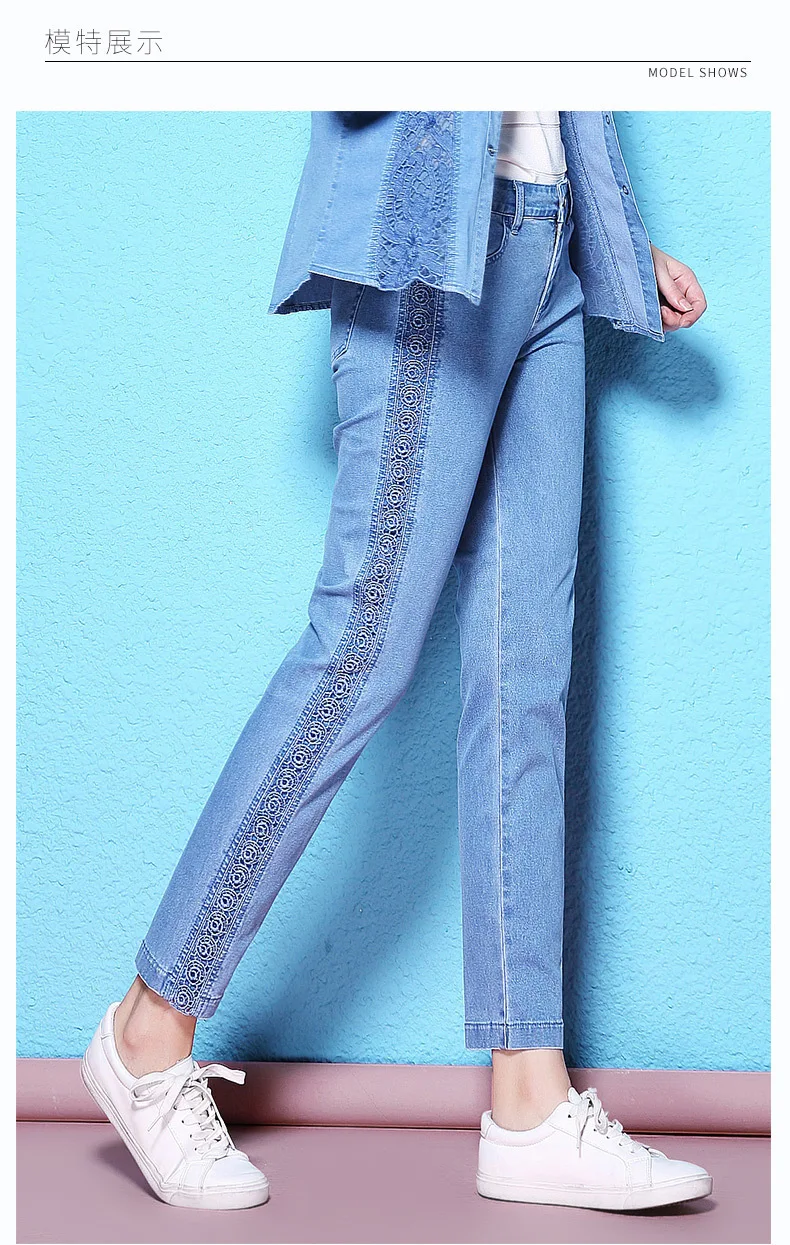 Летние и осенние стильные кружевные эластичные голубые джинсы до щиколотки с вышивкой, дышащие тонкие джинсы для женщин NW17C1200 | Ткань:Хлопок 90% spandex2 %,lanon8 % | ||||