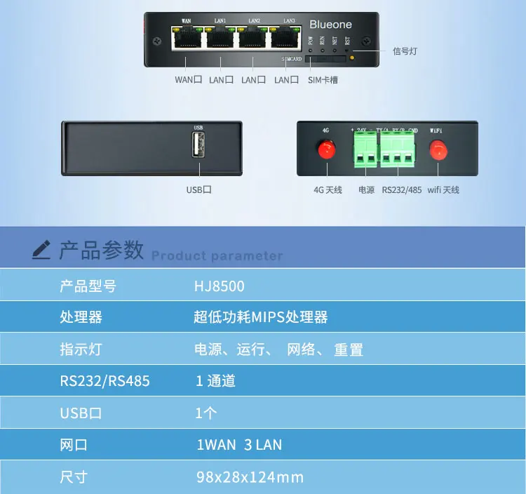 HJ8500 Промышленный маршрутизатор 3G 4G использует встроенную ОС Linux, промышленный процессор низкого энергопотребления и модули связи промышленного класса. Поддерживает1 порт WAN, 3 порта LAN, WiFi, 1 порт RS232, 1 порт RS485И1 usb-порт. (Опционально4G)