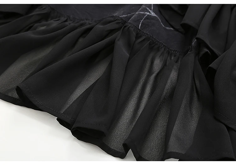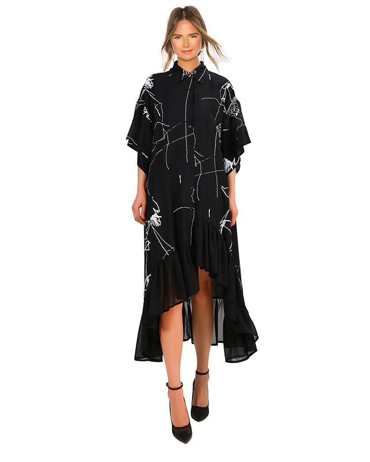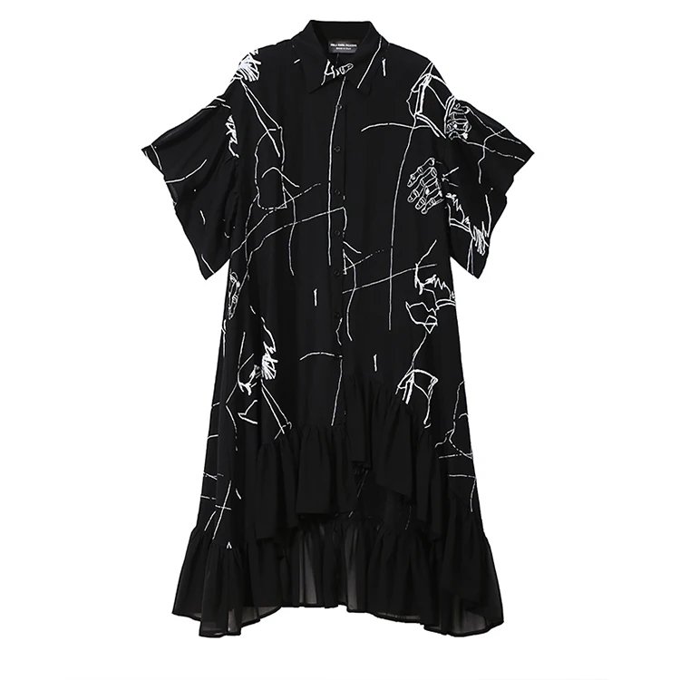 Уникальный стиль уличной одежды, женское летнее черное Повседневное платье-рубашка больших размеров с рукавом до локтя и оборками, женское платье с принтом, свободное платье 3751