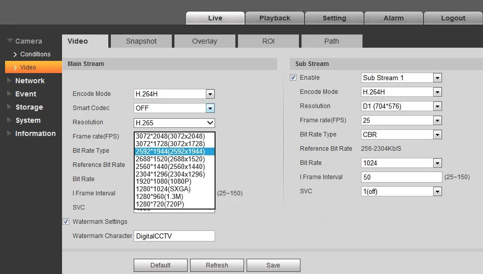 Resolution : 6M(3072×2048)/5M(3072x1728)/ 5M(2592×1944)/ 4M(2688×1520)/ 3M(2048x1536)/ 3M(2304×1296)/ 1080P(1920×1080)/1.3M(1280x960)/ 720P(1280×720)/ D1(704×576/704×480)/VGA(640×480)/ CIF(352×288/352×240)