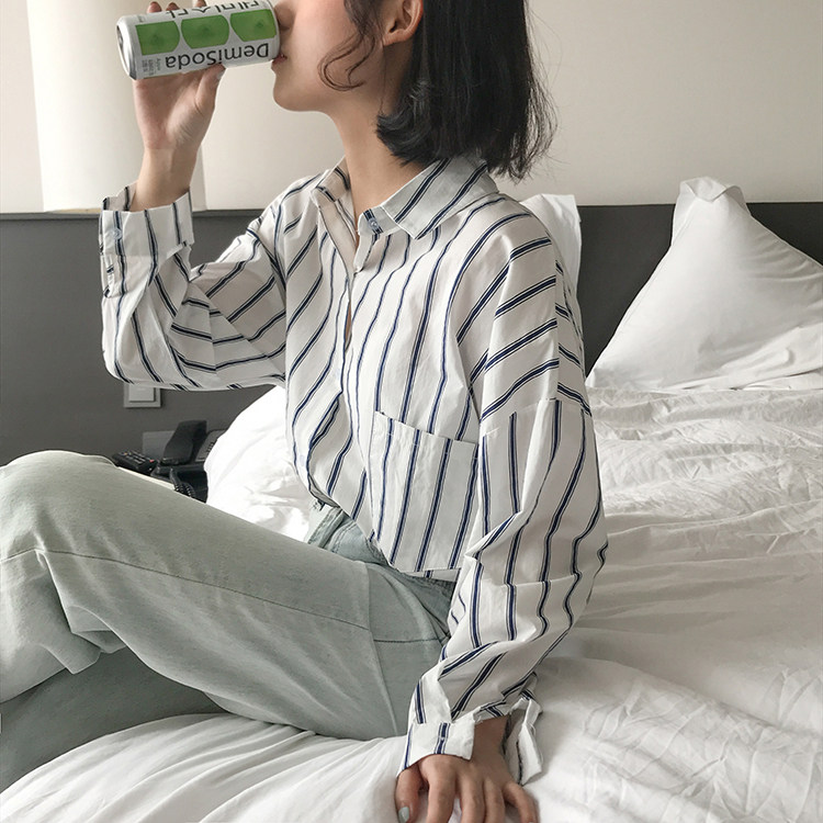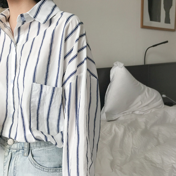 3 цвета, осень 2018, свободная рубашка с длинным рукавом в стиле breif, консервативный стиль, Базовые Женские блузки в полоску
