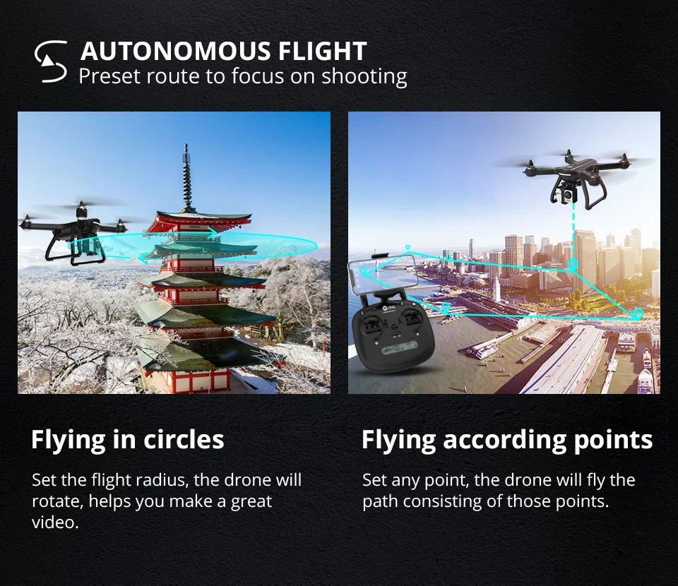 ● 6-Axis ● Фиксированная высота ● Одностороннее снятие/посадка ● Разблокировка одной кнопкой/Умный Замок: безопасный полет ● Безголовый режим ● Аварийная остановка (Длительное нажатие кнопки блокировки) ● Можно переключать функцию GPS (в помещении нет силы, чтобы выйти из GPS, может летать напрямую) ● GPS Глобальная система позиционирования ● 5G 1080P FHD Wi-Fi регулируемая камера (руководство) 110 ° FOV широкий угол> передача видео 400 м ● Бесщеточный двигатель> 25 км/ч ● 2800 мАч модульный подключаемый аккумулятор> 20 минут автономной работы ● Максимальное расстояние дистанционного управления 2,4G 999 M ● RTH one-key return home (GPS) (низкий заряд батареи/потеря подключения/умный возврат домой) ● Режим Smart Follow (GPS) ● Двусторонняя сигнализация низкого заряда батареи (сигнализация низкого заряда батареи самолета + Сигнализация низкого заряда батареи дистанционного управления) Приложение> ● Настройка маршрута полета: Полет по траектории: Установите радиус полета, самолет вращается, чтобы облегчить обрамление видео; Фиксированная точка/трек полета: Установите любой маршрут/точку, и самолет будет летать по маршруту, Соединенному пунктирной линией. ● Установите высоту полета/Расстояние/окружность радиуса полета.