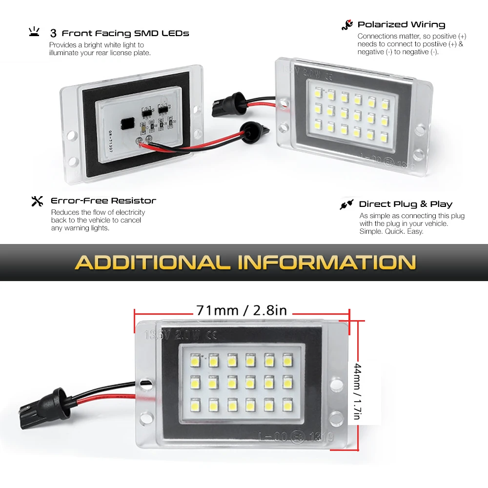 1. 100% Plug and Play, идеальная замена OEM, без сообщения об ошибке 2. Встроенная схема для напряжения постоянного тока 12 В, без ошибок 3. Строгий заводской контроль качества, надежное качество гарантирует Вашу безопасность 4. Качественные запасные части, гораздо более длительный срок службы и низкое потребление напряжения 5. Прямое изменение вашего желтоватого номерного знака Светильник лампы на этот яркий ксеноновый белый светильник высокой мощности