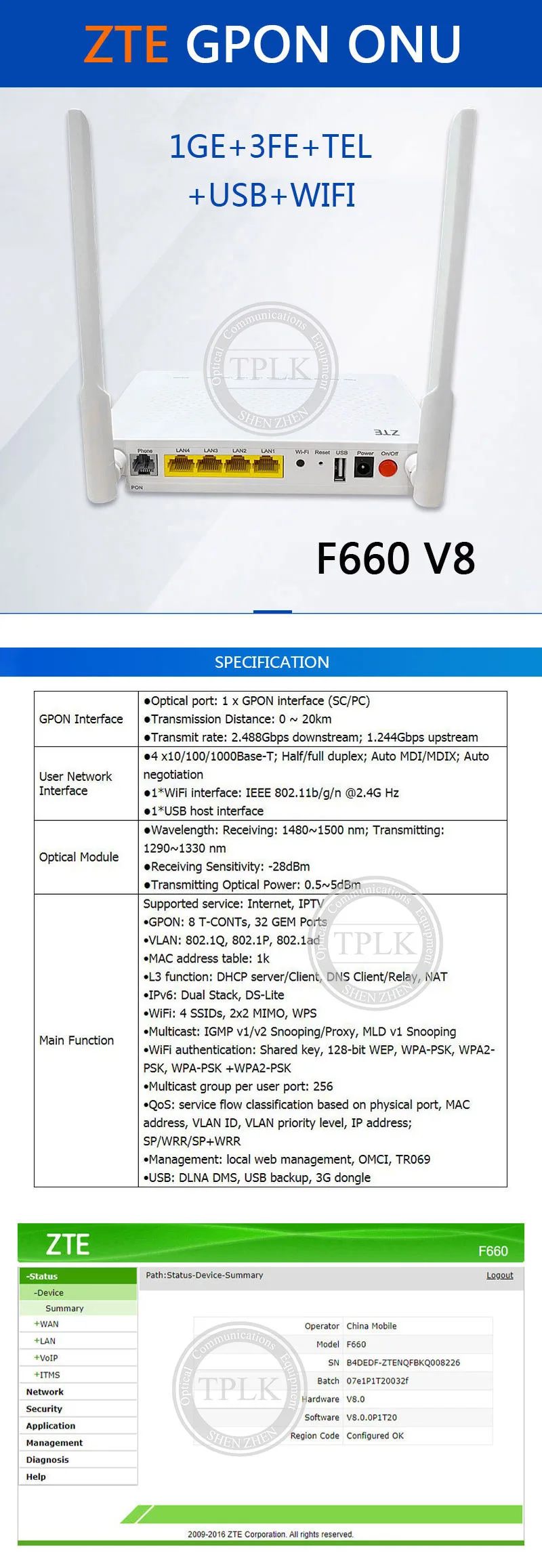 Номер модели: ZTE F660 V8 ONU/ONT GPONПорт:1GE + 3FE+ 2 телефона+ WIFI + USBРазъем: SC/UPCXPON:GPONЦвет: белыйМесто происхождения: КитайПрименение: Сеть FTTH FTTB FTTXПрошивка: Английская прошивка