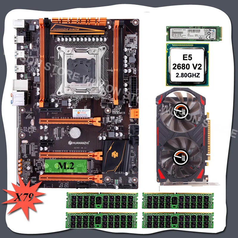 HUANANZHI X79 Deluxe материнская плата с M.2 слотом WIFI + Xeon E5 2680 V2 CPU + 4*8G 1600 DDR3 RECC + кулер адаптер + SATA кабель + металлический задний щит + диск драйвера + Руководство пользователя + GTX750TI 2G видеокарта + Samsung 128G PCI-E NVME SSD 2280