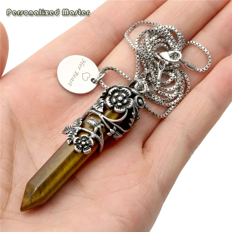 Индивидуальная подвеска на заказ, ювелирное изделие, античный серебряный цвет, обернутый цветок, натуральный камень, шестиугольное целебное ожерелье с подвеской Характеристика: -- 100% новый и высокое качество -- Материал: медь + драгоценный камень -- Количество: 1 ожерелье + коробка -- Вес: 25 -- Размер: Кулон (с отверстием):66*14 мм отверстие: 7*5 мм -- Круглая часть: 12 мм -- Длина цепочки: 24'' -- О Гравировке: Две стороны (две стороны оппонента) оба могут быть выгравированы 2 линиями; Линия 1 может быть выгравирована в пределах 8 символов; Линия 2 может быть выгравирована в пределах 10 символов (включая пространство и специальные Персонаж). -Примечание: пожалуйста, отправьте нам сообщение о персонализированном шрифте и Содержание ниже в течение 24 часов.