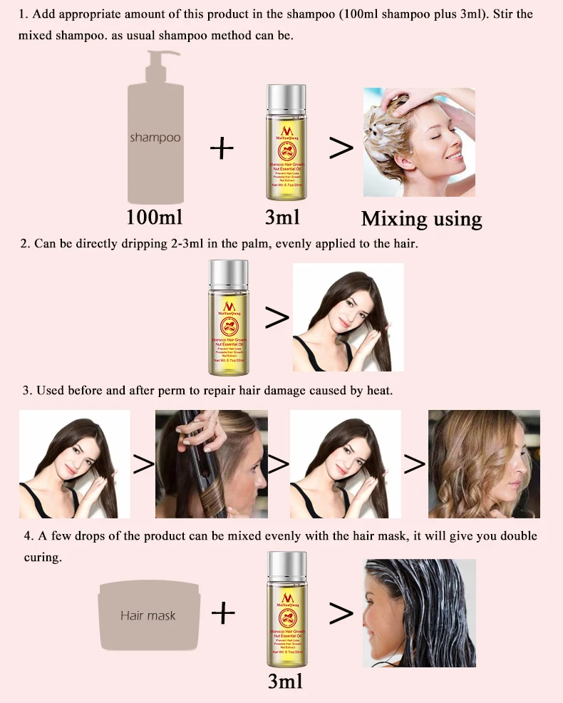 1. Добавьте соответствующее количество этого продукта в шампунь (100 мл шампунь плюс 3 мл). Перемешать смешанный шампунь. Обычный способ шампуня может быть. 2. Можно непосредственно капать 2-3 мл в ладонь, равномерно наносить на волосы. 3. Использовать до и после завивки для восстановления повреждения волос, вызванных нагревом. 4. Несколько капель продукта можно смешать равномерно с маской для волос, это даст вам двойное лечение.