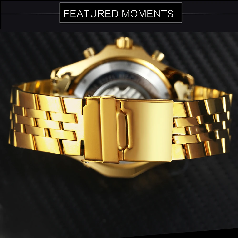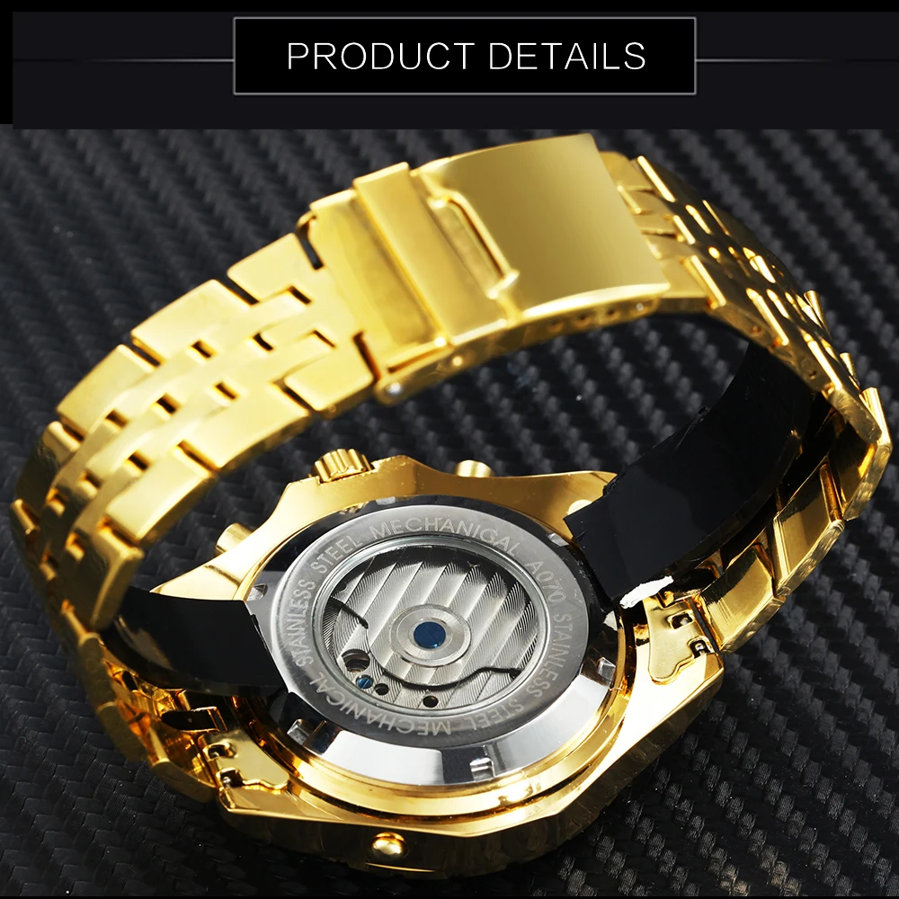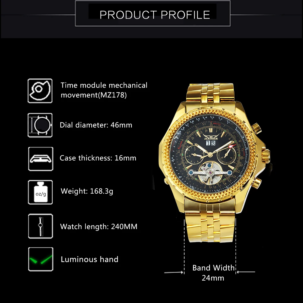 Классическое платье JARAGARЧасыБренд: JARAGARСтиль: Модный, Повседневный, деловой, роскошный, спортивныйОсновная особенность:1. Часы креативного дизайна, модный стиль платья2. Горячая Распродажа часов с ремешком из нержавеющей стали.3. Гарантия на 12 месяцевХарактеристики:-Диаметр циферблата: 46 мм-Чехол Толщина: 16 мм-Длина часов: 240 мм-Ширина ремешка: 24 мм-Вес часов: 168,3 г-Механизм: автоматический самоветер-Механический (без батареи)-Материал зеркала: Hardlex-Тип застежки: складная застежка с безопасной-Функция: Отображение даты; Вспомогательные циферблаты могут работать; Светящиеся стрелки-Водонепроницаемость: Водонепроницаемость (не для плавания или душа)Подходящий повод:Идеально подходит для всех случаев и мероприятий: вечерние, юбилейные, деловые, повседневные, спортивные, домашние или повседневныеПосылка включает в себя:Часы-1 шт. (подарочные коробки на выбор)
