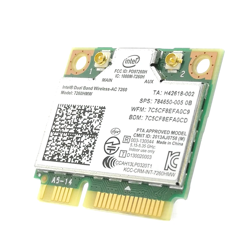 Если у вас есть какие-либо вопросы, вы можете оставить сообщение по электронной почте, мы ответим как можно скорее. Мы имеем богатый запас и выгодную цену, с нетерпением ждем долгосрочного сотрудничества с вами. Мы ожидаем вашего приезда для переговоров! Описание: Модель: 7260HMW Интерфейс: Mini PCI-E Диапазон частот: Dual band 2,4 ГГц/5 ГГц Скорость: до 867 Мбит/с Сетевой стандарт: 802.11a/b/g/n/ac Bluetooth: 4,0 Поддерживаемые операционные системы: Win7, Win8,win 10 Характеристика: Поддерживается по технологии Intel vPro Технология Intel Smart Connect Технология Intel Smart Connect автоматически обновляет приложения, такие как электронная почта и социальные сети, когда ваш компьютер спит. Благодаря технологии Intel Smart Connect вам не придется ждать обновления приложений при пробуждении компьютера. 802.11ac, двухдиапазонный, 2x2 Wi-Fi плюс Bluetooth адаптер, который позволяет двигаться со скоростью жизни с более быстрой скоростью (до 867 Mbps1), более высокой емкостью, более широким покрытием, И более длительный срок службы батареи. В сочетании с процессорами 4-го поколения Intel® Core™ и исключительными беспроводными инновациями Intel®, двухдиапазонный беспроводной-AC 7260 радикально изменил ваш опыт подключения дома, работы или на ходу. Совместимость с: Эта карта является универсальной версией,Он может использоваться на Dell/Sony/ACER/ISUS/MSI/Clevo/Terransforce/Hasee и т. Д., который является mini pcie полуразмерным интерфейсом. Не для IBM, Lenovo и HP машин.Можно использовать после перезаписи белого цвета. Посылка включает: 1 * 7260NGW 2 * винты