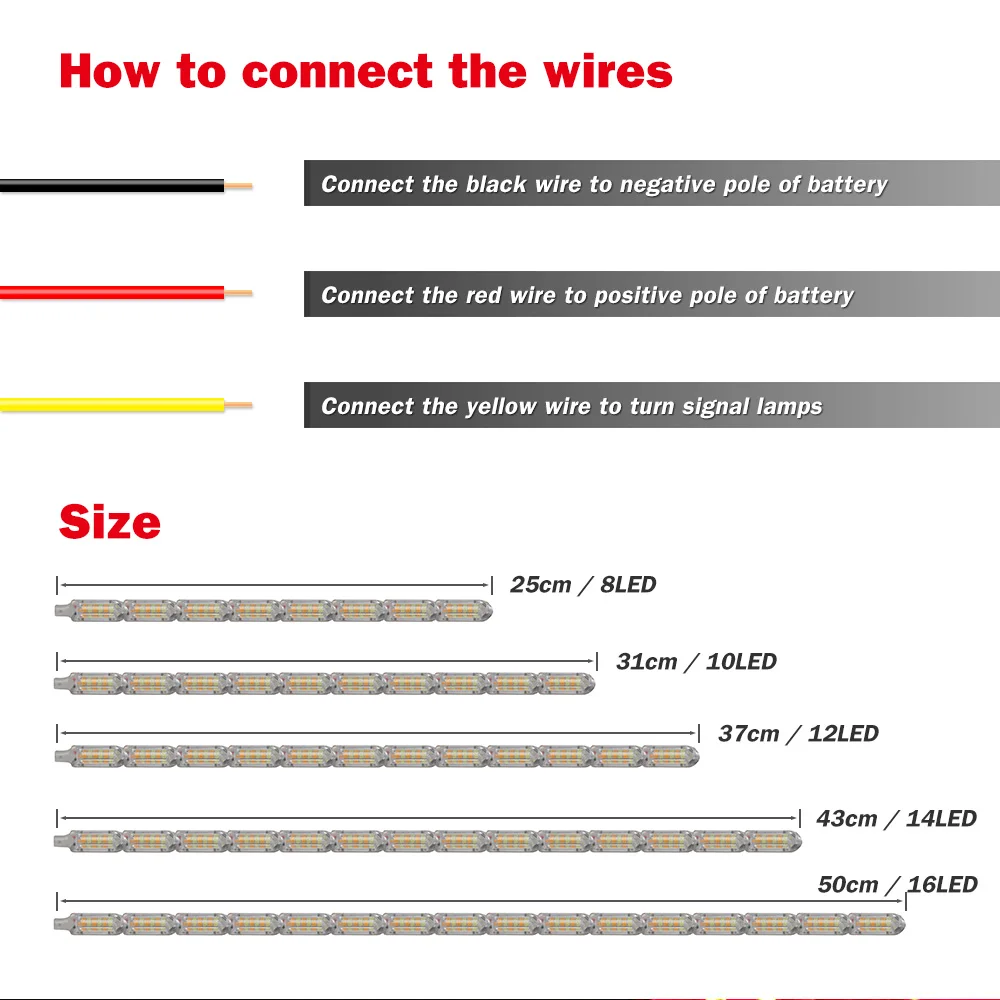 Цвет: белый и желтый, красный и желтыйВход: DC12VРазмер: 25 см/31 см/37 см/43 см/50 смМощность: 3-6 Вт (каждый элемент гибкий drl)Яркость: 250 лмПосылка включает в себя: