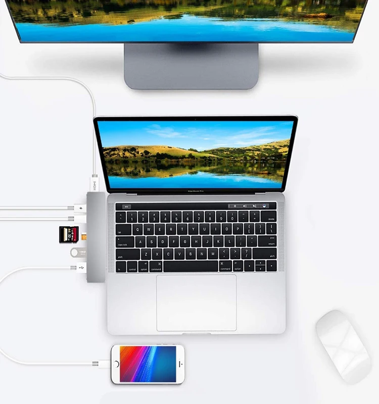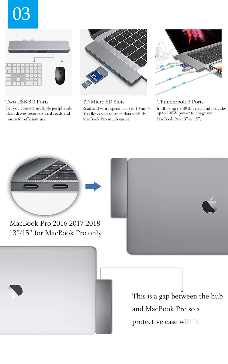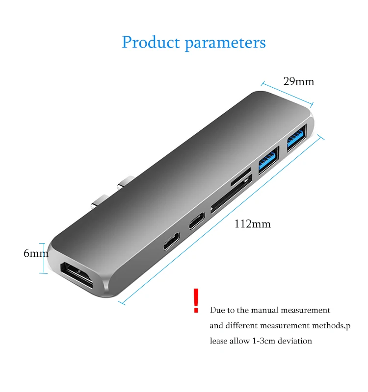 Особенности: 1,4 K HDMI порт: поддерживает внешние мониторы, телевизоры, проекторы разрешения до 4k @ 30 Гц. 2. Поддерживает скорость передачи данных USB 3,0 и Type C до 5 Гбит/с. 3. Два разъема Type-C надежно крепятся к вашему Macbook и обеспечивают мгновенное и стабильное расширение, отличное расширение адаптера для подключения нескольких устройств/аксессуаров. 4. Интерфейс Thunderbolt3 Type-c, может достигать: передача данных, двунаправленная зарядка и передача видео три функции. Обратите внимание: 1. Не поддерживает внешний супер-накопитель Apple. 2. Не удается считать ручка внешних жестких дисков, чем 2 ТБ. 3. Рабочая температура ступицы составляет около 40/104F. 4. Подходит правильно, если у вас есть чехол/крышка на вашем MacBook Pro. 5. Подключите все внешние периферийные устройства перед использованием ti, чтобы обеспечить более стабильное соединение. 6. Порт USB3.0 не будет работать с клавиатурой Apple USB. Упаковочный лист: 1 * Тип C к HDMI 7 в 1 концентратор
