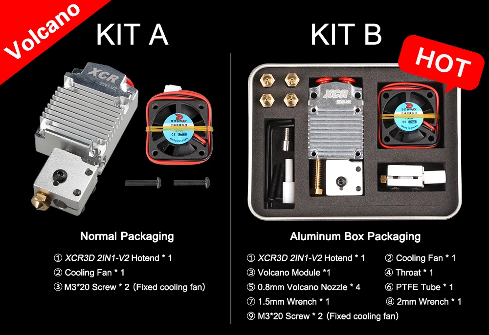 Пожалуйста, обратите внимание:Только NV6 hotend дает силиконовые носки, потому что силиконовые носки не совместимы с вулканом hotend,Таким образом, вулкан hotend не дает силиконовые носки. Спасибо за понимание. Оба hotend дадут охлаждающий вентилятор.