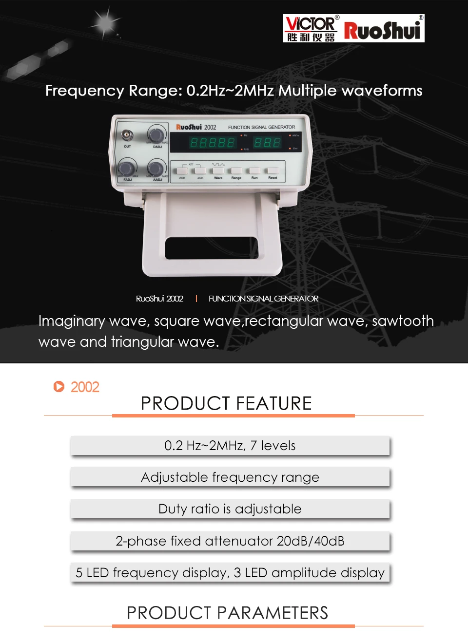 Victor Instruments посвятил себя разработке и производству измерительных приборов более 30 лет. VICTOR также стал ведущим брендом для измерительных приборов в Китае, но RuoShui новый бренд будет использоваться для замены VICTOR на международном рынке постепенно. Здесь мы заявляем, что в течение переходного периода вся продукция, продаваемая в официальном магазине RuoShui, является оригинальной продукцией, но будет поставляться под логотипом VICTOR или RuoShui (зависит от наличия товара), И наслаждайтесь тем же послепродажным обслуживанием и политикой обеспечения качества.