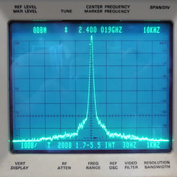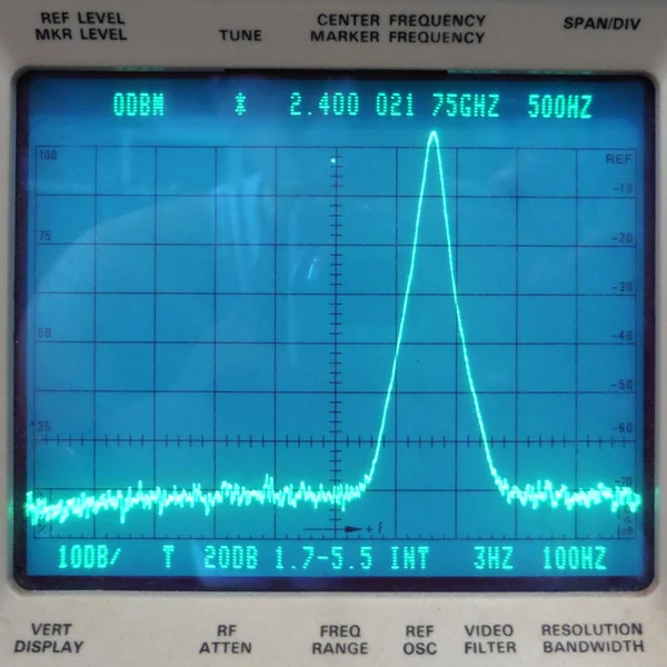 Фазовый шум, спектральная чистота, точность частоты и Стабильность Прямого синтезированного источника фиксированного частотного сигнала на основе кристаллического осциллятора близки к кристаллическому осциллятору. Его можно использовать в качестве источника часов DDS (например, AD9858) без установки и включения. Другие продукты могут быть настроены на другие частоты. Модель: KSGC-2400 Выходное сопротивление: 50 Ом Выходная частота: 2400 МГц + 100 ppm Выше гармоническая составляющая: > 20 dBc @ 4,8 ГГц Sub гармоническая составляющая: > 40 dBc @ 1,2 ГГц Другие гармонические компоненты: > 45 dBc Фазовый шум: -115 дбк/Гц @ 10 кГц Выходная мощность: 3 ~ 8 дБм Напряжение питания: + 5 В Рабочий ток: 175 ~ 200 мА Фазовый шум карта: