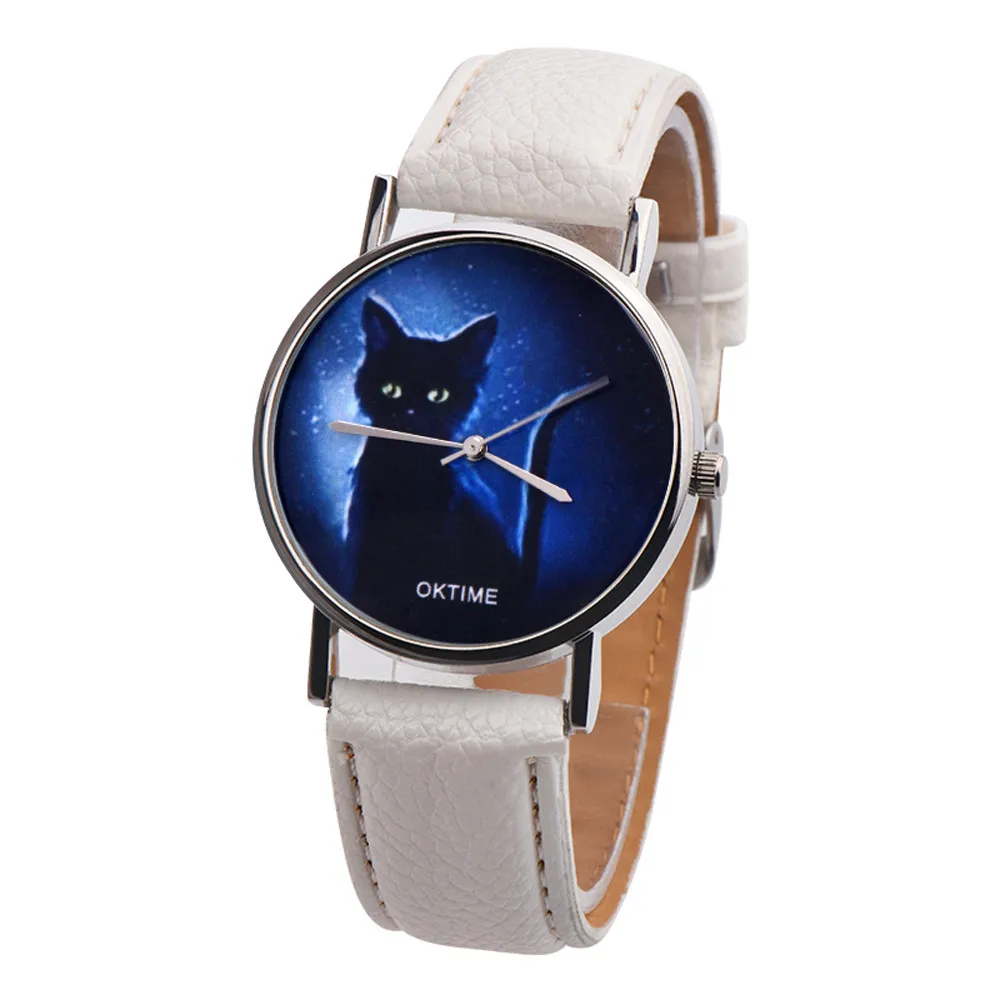 OKTIME женские таинственные черные кошачьи аналоговые кварцевые часы из искусственной кожи
