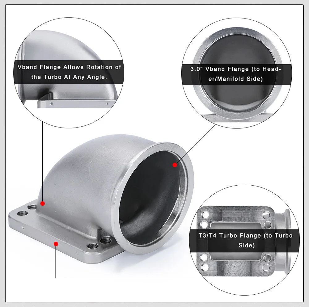 304 литой и обработанный адаптер из нержавеющей стали, с плотным радиусом. Работает для многих турбо-приложений.