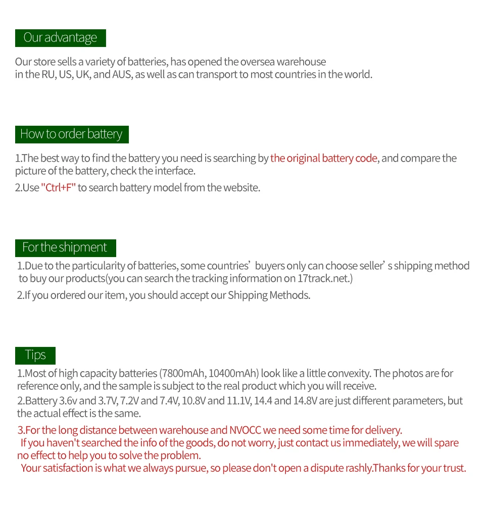 3. Батарея 3,6 v & 3,7 V, 7,2 V & 7,4 V, 10,8 V & 11,1 V, 14,4 & 14,8 V-это просто разные параметры, но реальный эффект одно и то же,Все товары доставляются.1. Из-за особенностей батарей покупатели некоторых стран могут выбрать только доставку продавца