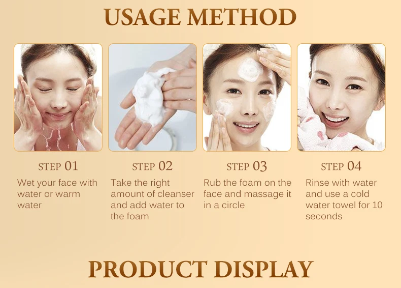 1. Увлажняет лицо теплой водой, 2. Возьмите необходимое количество продукта на ладонь, 3. Добавьте немного воды, обе руки быстро протрите равномерно, чтобы произвести пену, 4. Пена наносится на лицо, мягко массирует, медленно по всему лицу, 5. Во избежание морщин. Через минуту, с влажным полотенцем, мягко нажмите на лицо, повторите несколько раз, чтобы удалить очищающее средство для лица. 6. В водную краску, в то время как лицо с прохладной водой полотенце светильник применить 10 секунд