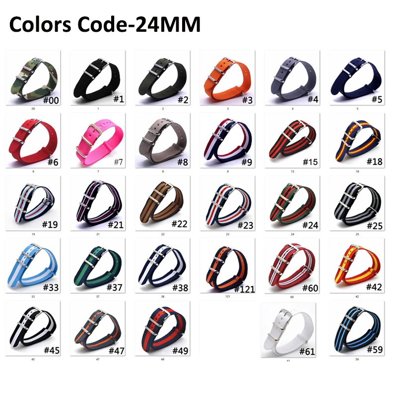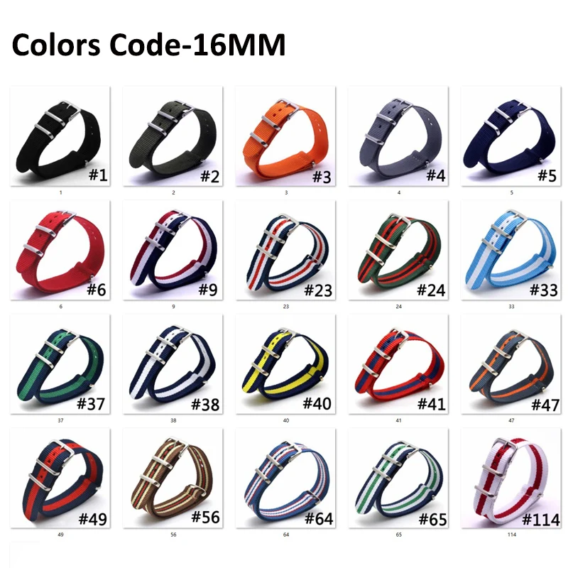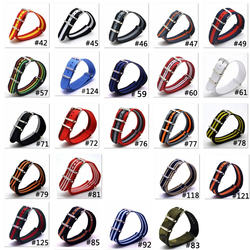 Разноцветный ремешок BUMVOR 16-24 мм в полоску для армейских спортивных часов, нейлоновый ремешок для часов James Bond Материал: нейлоновый ремешок, Пряжка из нержавеющей стали Ширина ремешка: 16 18 20 22 24 мм Длина ремешка: 265 мм Тип застежки: Пряжка Пружинная планка: в комплекте