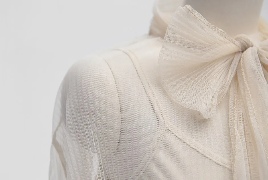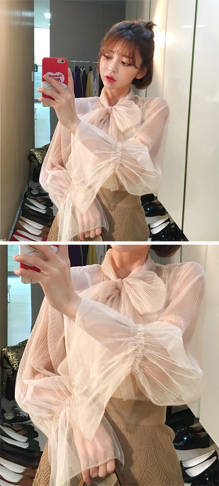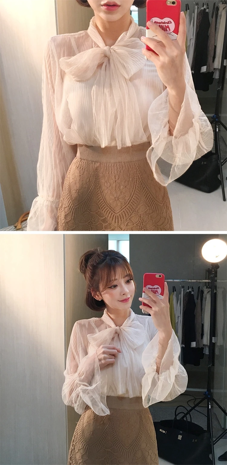 Женская прозрачная блузка с галстуком-бабочкой, элегантная белая кружевная блузка в Корейском стиле, весна-лето 2020, DF255