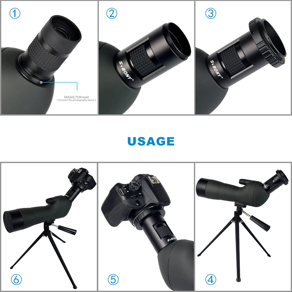 5. Использование: резьба т-адаптер в Т-кольцевой адаптер, затем резьба весь адаптер для крепления в Canon EOS DSLR/SLR для подключения к телескопу/микроскопу