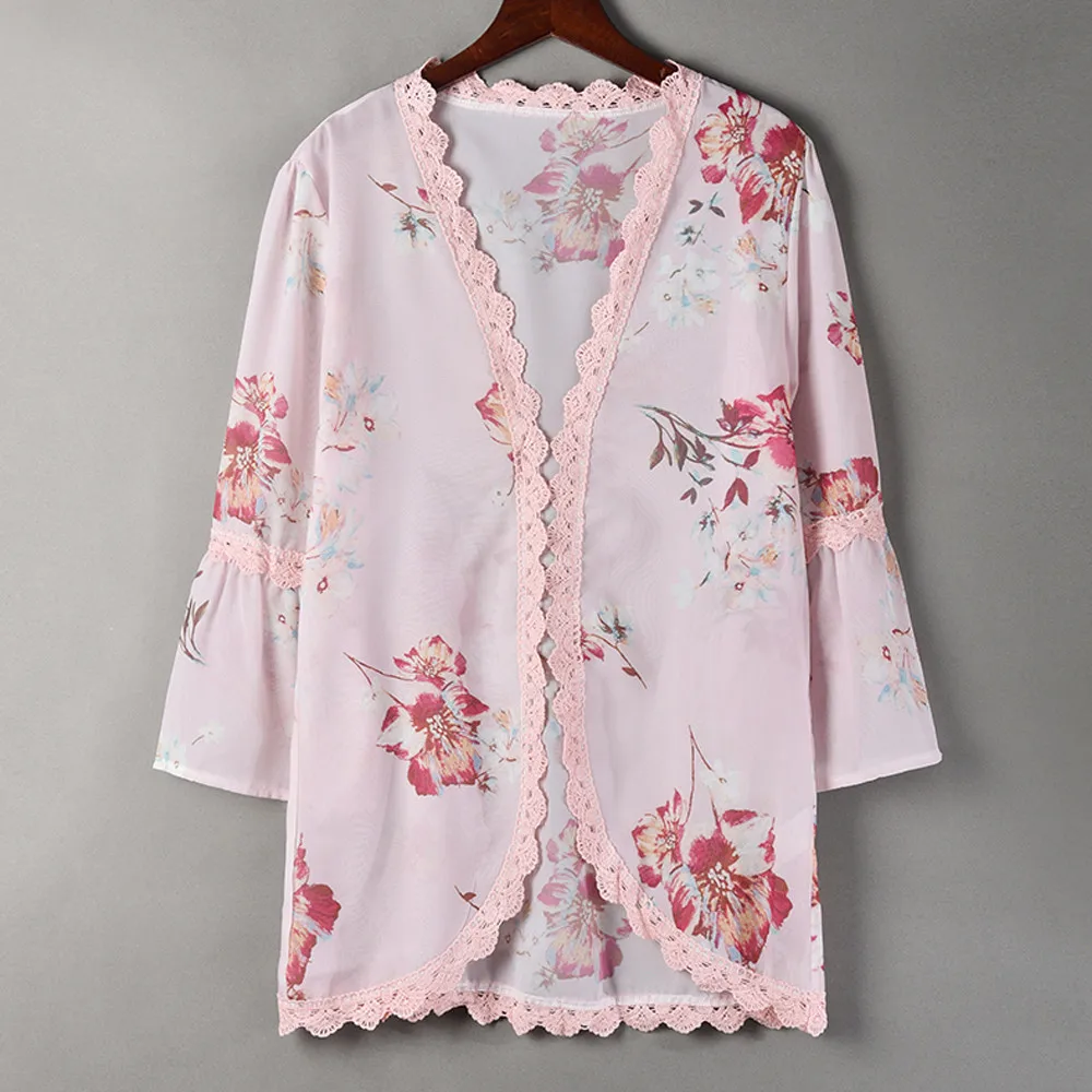 Женское шифоновое кружевное пальто с цветочным принтом, топ, костюм, кимоно, модный Халат