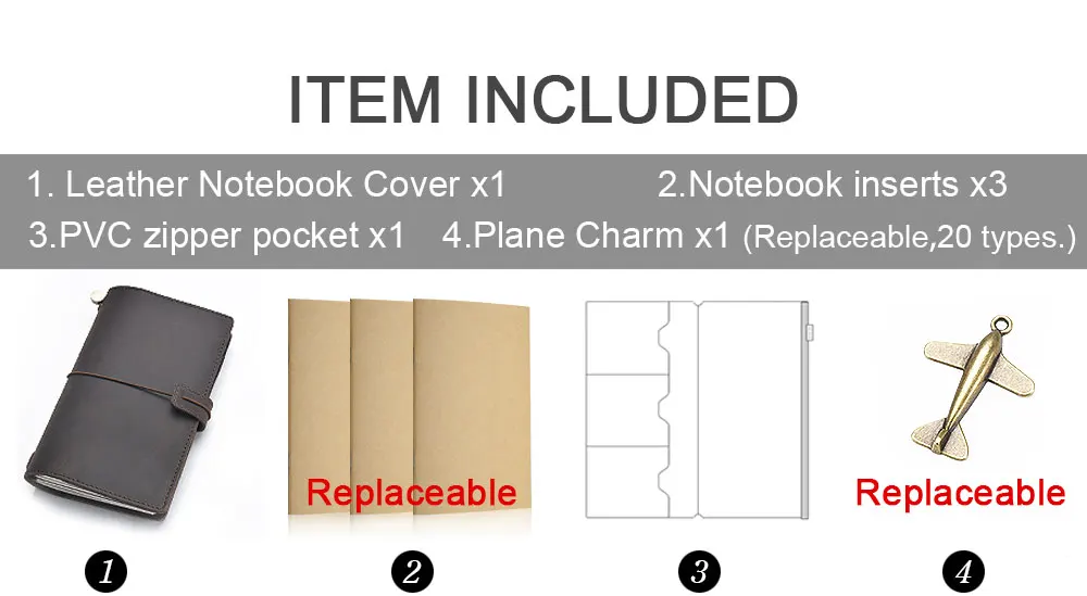 1. Кожаный чехол для ноутбука x1 2. Записная книжка вставляет x3 (пустой, правили, сетка, но вы можете оставить нам сообщение, чтобы изменить его, у нас есть 8 типов) 3. ПВХ карман на молнии x1 4. Шарм самолета x1 (вы можете оставить нам сообщение, чтобы изменить его, у нас есть 20 типов)