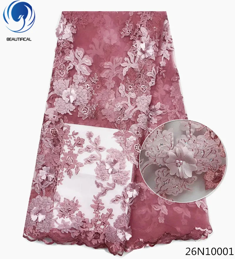 Красивый 2018 3d цветок кружева с бисером Африканский французский Тюль кружевная ткань в нигерийском стиле кружева ткани высокого качества 5 ярдов/партия 26N100