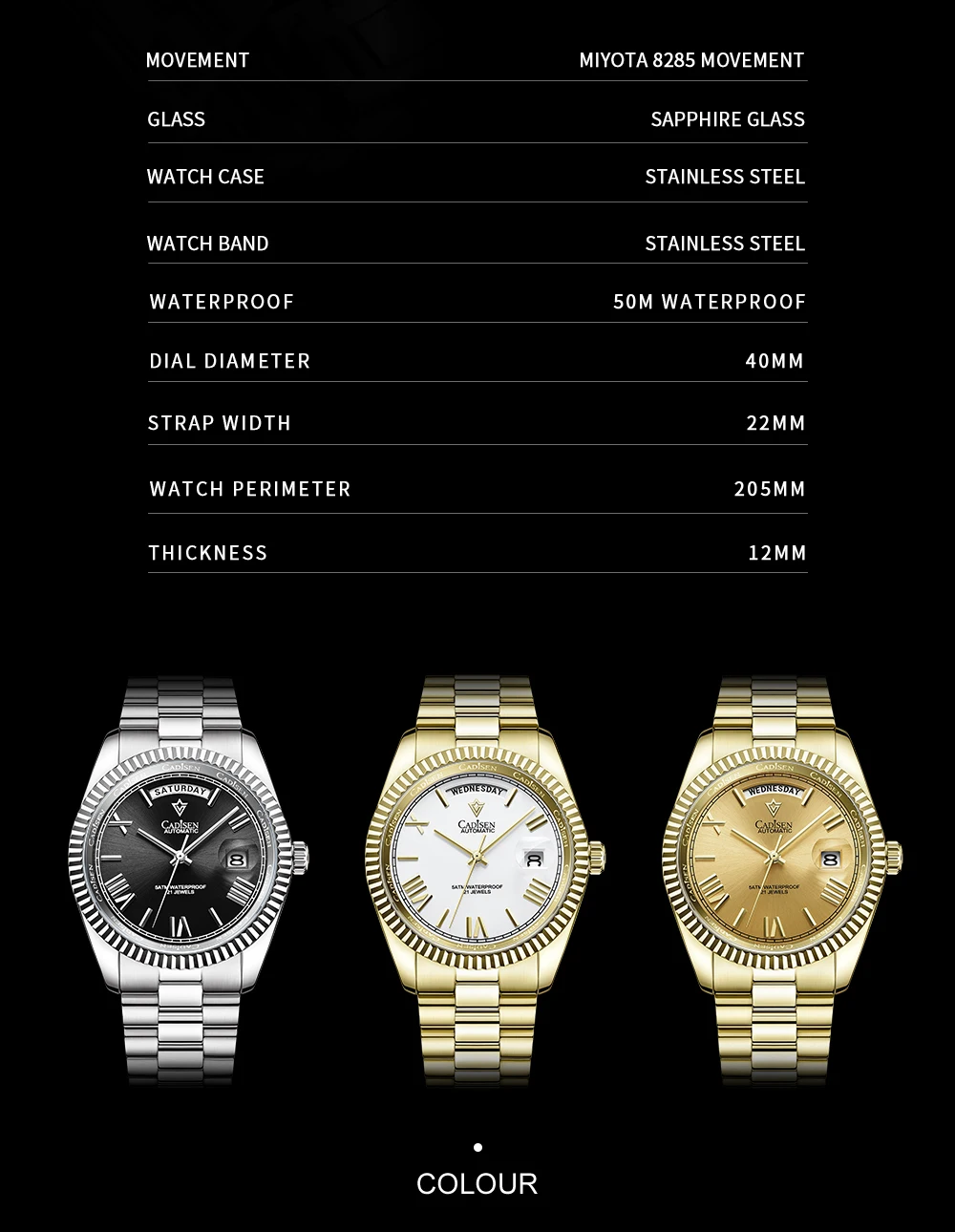 Описание: -100% новый и высокое качество. -Автоматические механические часы MIYOTA 8285. Для точного хранения времени. -Чехол из нержавеющей стали 316L и ремешок для часов из нержавеющей стали. -Сапфировое зеркало, устойчивое к царапинам. -Водонепроницаемость на глубине 50 м. Характеристики (прибл.): -Корпус Диаметр: 4,0 см прибл. -Корпус Толщина: 1,2 см прибл. -Диапазон Длина (в комплекте чехол): 20,5 см прибл. -Ремешок Ширина: 2,2 см прибл. Посылка включает в себя: -Новые часы One CADSIEN -Одна коробка. -Руководство по эксплуатации, гарантийный талон. -Одна тканевая салфетка для чистки часов