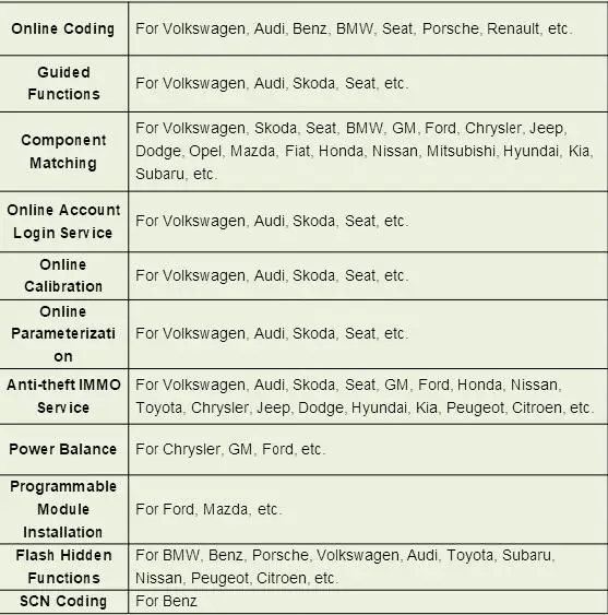 30 + сервисных функций для различных плановых характеристик обслуживания и обслуживания, включая: сброс масла, EPB, TPMS, BMS, тормозное кровотечение, DPF, Immo ключи, инжектор, SAS, подвеска, дроссельная заслонка, WIN DR крыша, сиденья, одометр, изменение Ланга, фары, CHG размер шин, TEC Learn, ABS/SRS, Цилиндр, турбонаддув, лимит, сцепление, адаптация, сброс подушки безопасности. Он обеспечивает адаптацию компонентов или различные функции кодирования для пользовательских конфигураций, а также позволяет перепрограммировать адаптивные значения для некоторых компонентов после ремонта. Наиболее часто выполняемые Сервисные функции включают: