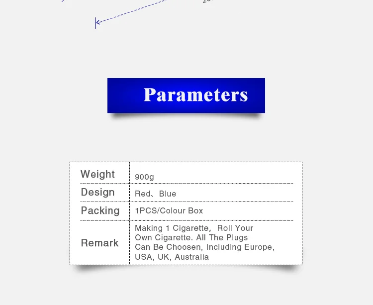 Единый размер: 26*8*6,5 см Общий вес: 900 г Цвет: красный Примечание: сворачивайте свою собственную сигарету Пакет включает в себя: 1 x роликовая машина 1 x протирочная бар (1 шт.); Сезон весна 1 штепсельная вилка стандарта ЕС/США Руководство пользователя-1 шт.;