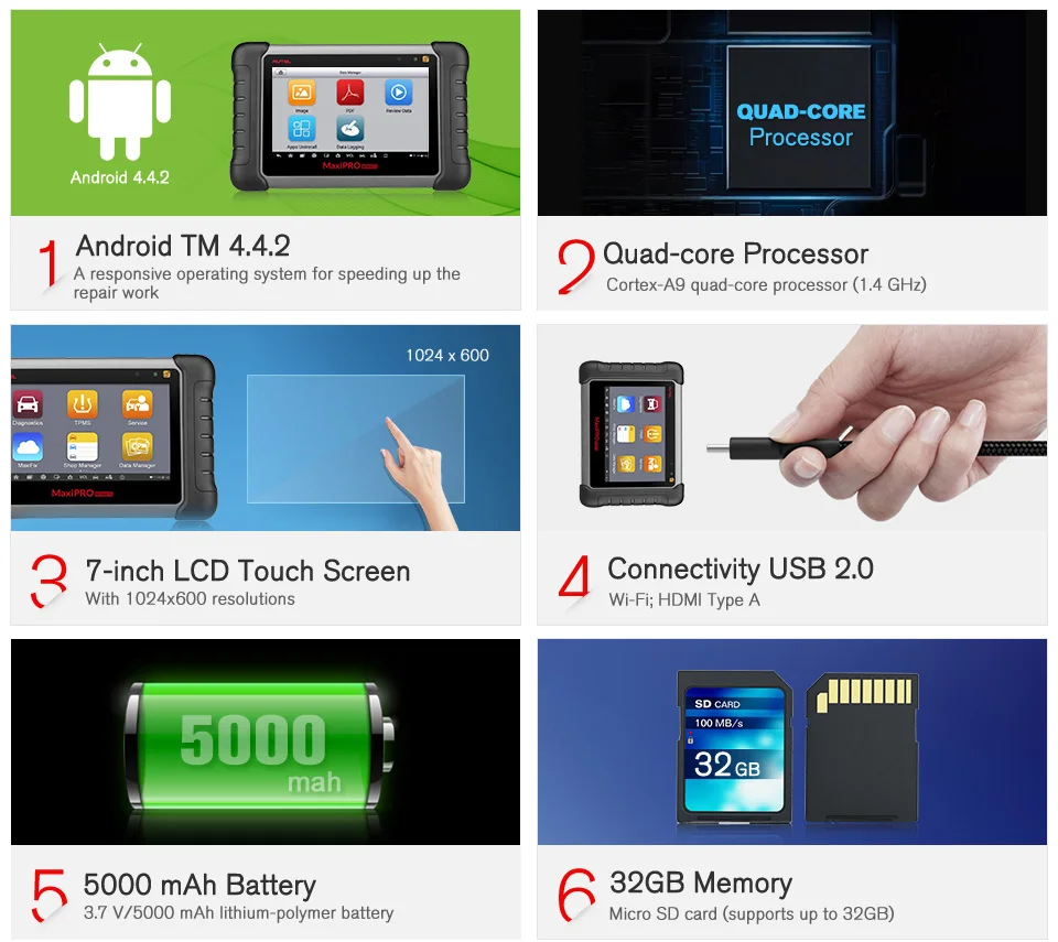 Операционная система:AndroidTM 4.4.2, KitKat Процессор:Четырехъядерный процессор Cortex-A9 (1,4 ГГц) Память:32 Гб Дисплей:7-дюймовый сенсорный экран LCD емкостный с разрешением 1024x600 Подключение: Мини-usb 2,0 USB 2,0 Wi-Fi HDMI типа A Слот для карт Micro SD (поддерживает до 32 ГБ) Датчики:Датчик освещения для автоматической регулировки яркости Аудио вход/выход Входное напряжение: N/A Ток на выходе:Звуковой сигнал Питание и батарея:3,7 V/5000 mAh литий-полимерный аккумулятор Зарядка через блок питания 5 в постоянного тока Тестирование Время работы от аккумулятора:Около 7 часов непрерывного использования Аккумулятор зарядный вход:5 В/1,5 а Потребляемая мощность:600 мА (вкл. ЖК-дисплей с яркостью по умолчанию, вкл. Wi-Fi) 3,7 в Рабочая температура:От 0 до 55 °C (от 32 до 131 °F) Температура хранения:От-20 до 60 °C (от-4 до 140 °F) Рабочая влажность:5% - 95% без конденсации Размеры:(Ш x В x Г) 270,8 мм (10,0 ”) x 176,0 мм (6,9”) x 36,0 мм (1,4 ”) Вес нетто:885 г (2,31 фунтов) Протоколы: ISO9141-2, ISO14230-2,ISO15765, K/L-Line, мигающий код, SAE-J1850 VPW, SAE-J1850PWM, ISO11898 (высокоскоростной, средний, низкоскоростной и однопроводный CAN, отказоустойчивый CAN), SAE J2610,GM UART,UART эхо-байтовый протокол, Honda Diag-H протокол, TP2.0, TP1.6
