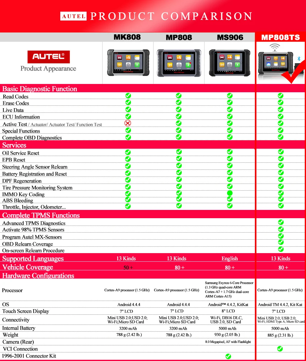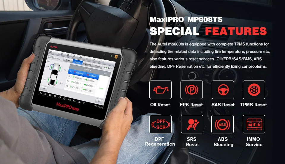 Autel MaxiPRO MP808TSАвтомобильный диагностический сканерФункция обслуживания TPMS и беспроводной Bluetooth (Основная версия Maxisys MS906TS)Говорит о том, что оно разделяетТе же характеристики, что и DS808/MS906. 1. Полные функции TPMS: диагностический инструмент способен активировать/считывать 98% известных датчиков TPMS, считывать и очищать коды TPMS, отображать специфические для производителя TPMS процедуры повторного обучения для всех транспортных средств, выполнение OBDII Relearns и программирование mx-датчиков для замены OE-датчиков. 2. Полные системные функции: считывание и очистка кодов неисправностей для всех систем; Поиск и устранение связанных проблем и выключение предупреждающих огней. 3. Специальные Особенности: · расширенные диагностики с полной функцией TPMS помогут пользователям определить давление в шинах; наряду с сервисами Oil/EPB/SAS/BMS/DPF/ IMMO и ABS/SRS для точности и эффективной диагностики автомобиля. 4. Беспроводная Функция: Wi-Fi и Bluetooth интерфейс связи транспортного средства (VCI) позволяет устройству выполнять широкий диапазон диагностики OE уровня. 5. Тест в один клик: поддерживает быстрый тест всех систем транспортных средств одним щелчком для определения кодов и устранения проблем, и один шаг для полной проверки состояния TPMS.